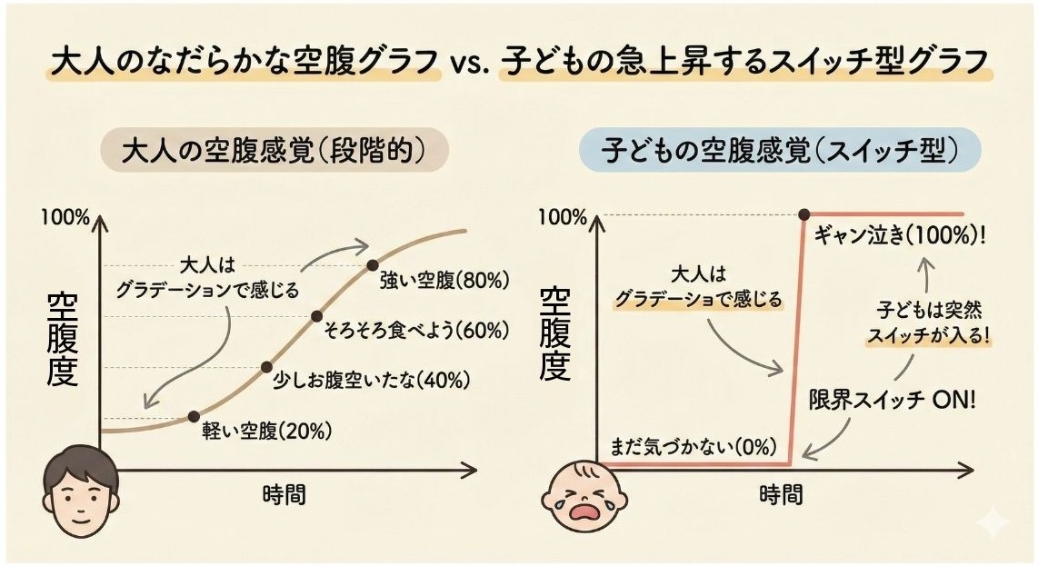 大人の場合、「あ、少しお腹が空いてきたな(20%)」→「そろそろ食べようかな(60%)」というように、空腹感をグラデーションで感じることができます。